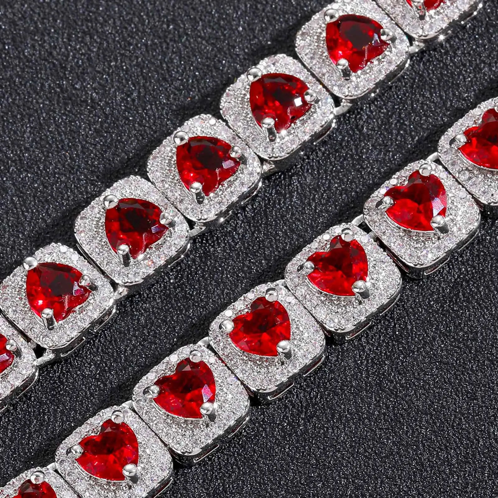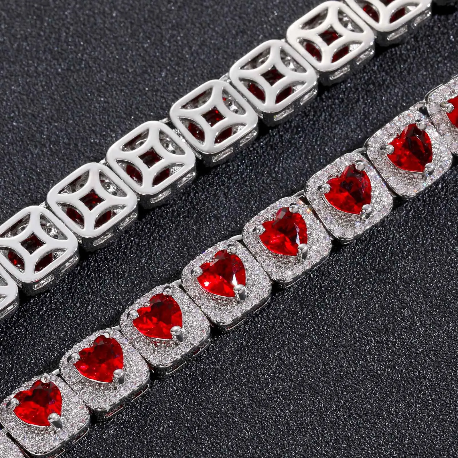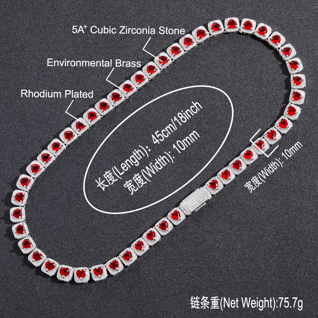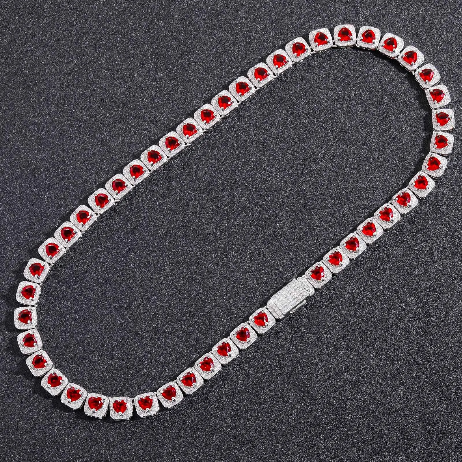 10mm Heart Shaped Rock Sugar Chain Personalized Red Diamond Tennis Necklace with Heart CZ Hip Hop Style Fashion Chain for Women