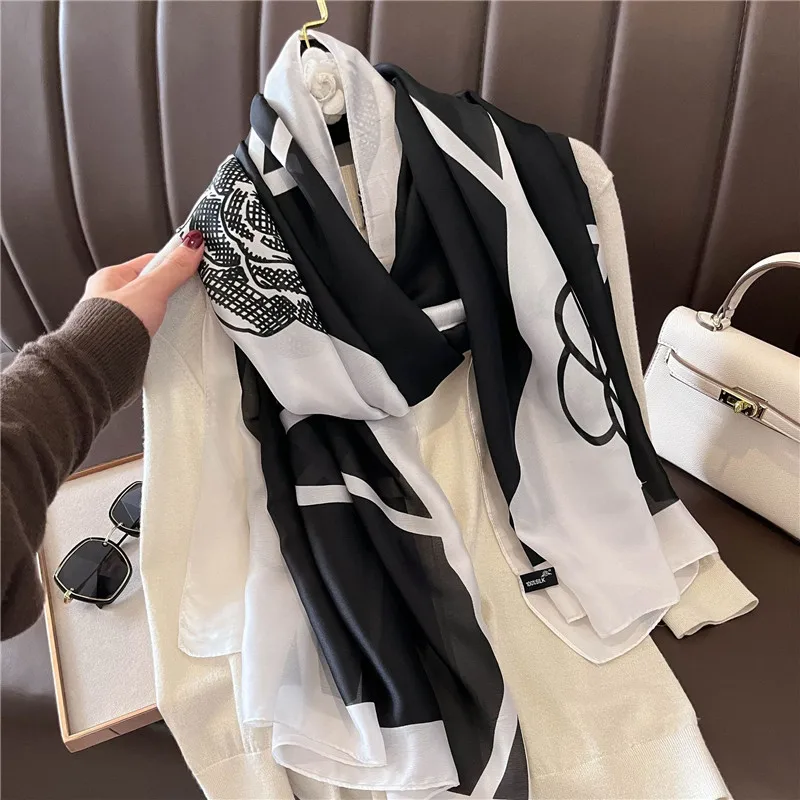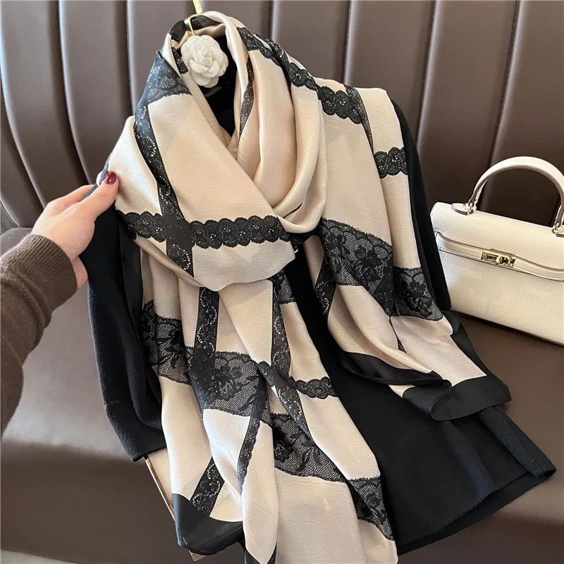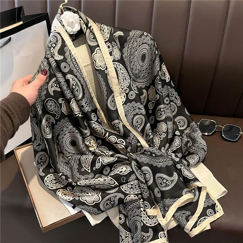 2022 Fashion Brand Women Silk Scarf Luxury Dark Green Aztec Floral Pashmina Shawls Wrap Soft Foulard Femme Muslim Hijab 180*90Cm