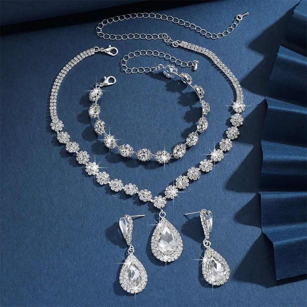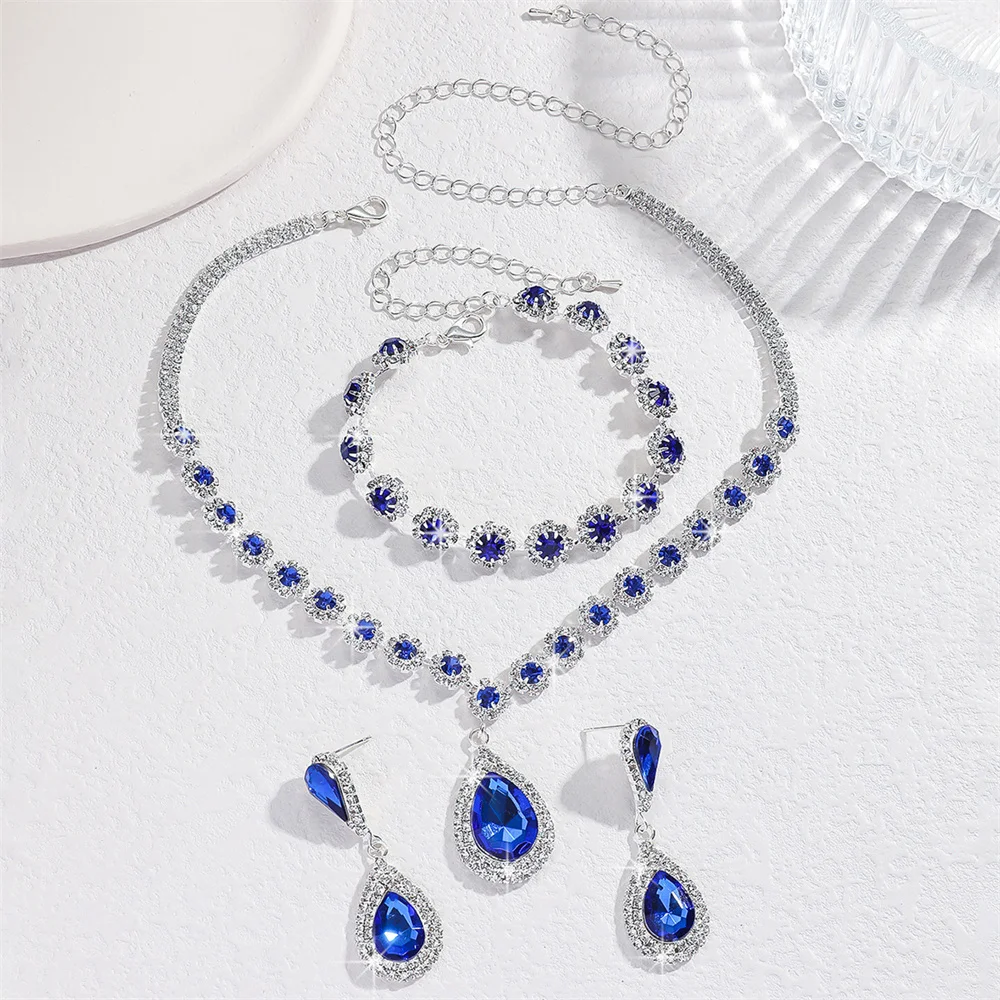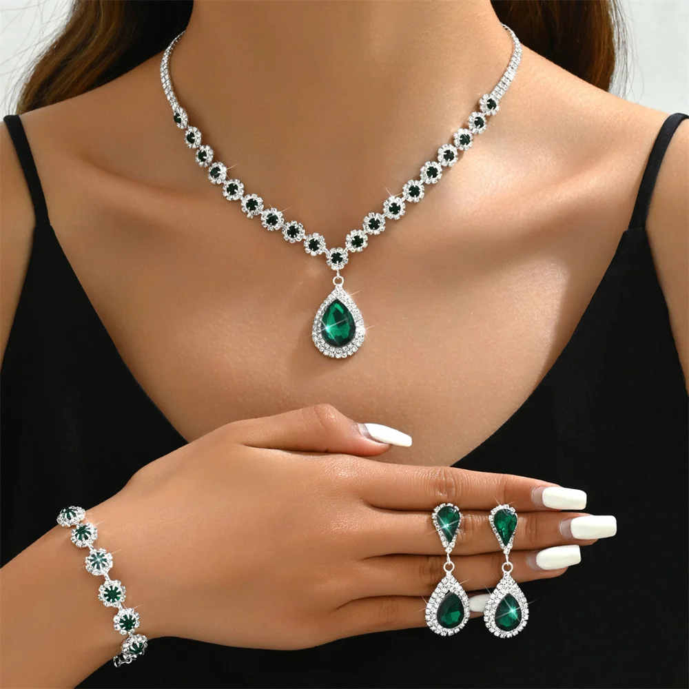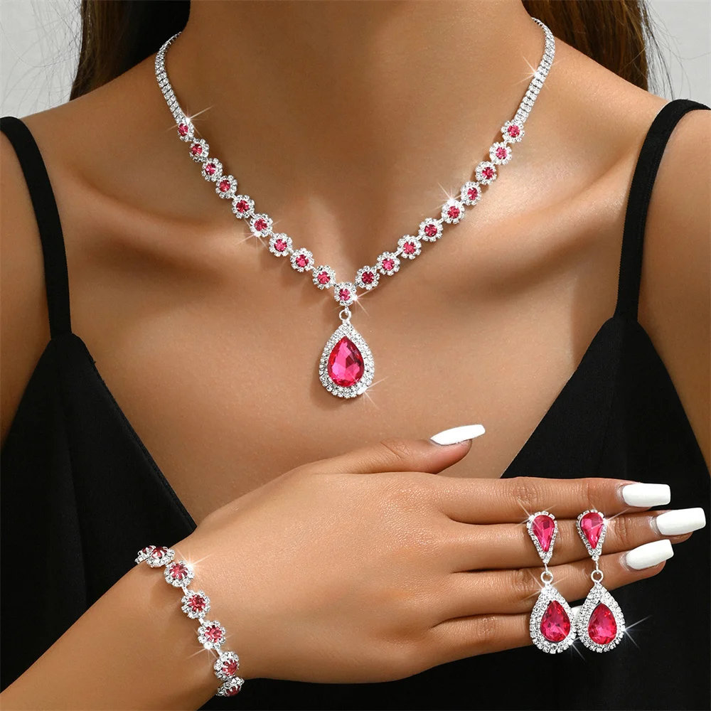 3/4PCS Luxury Crystal Necklace Earrings Bracelet Set Women Red Green Blue Water Drop Pendant Wedding Party Bride Jewelry Gifts