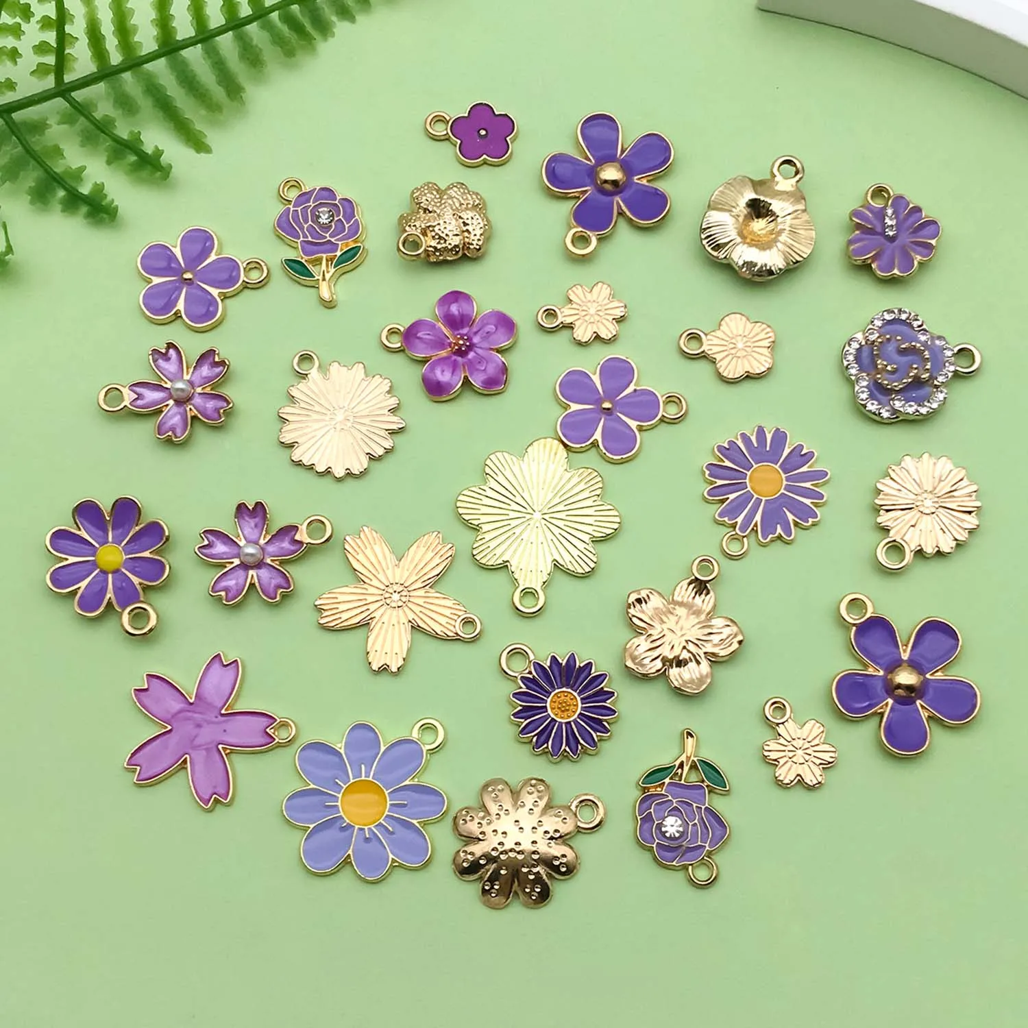 30pcs Purple Enamel Flower Charms Alloy Small Daisies, Cherry Blossoms, Rose Flower Pendants For DIY Jewelry Making Accessories