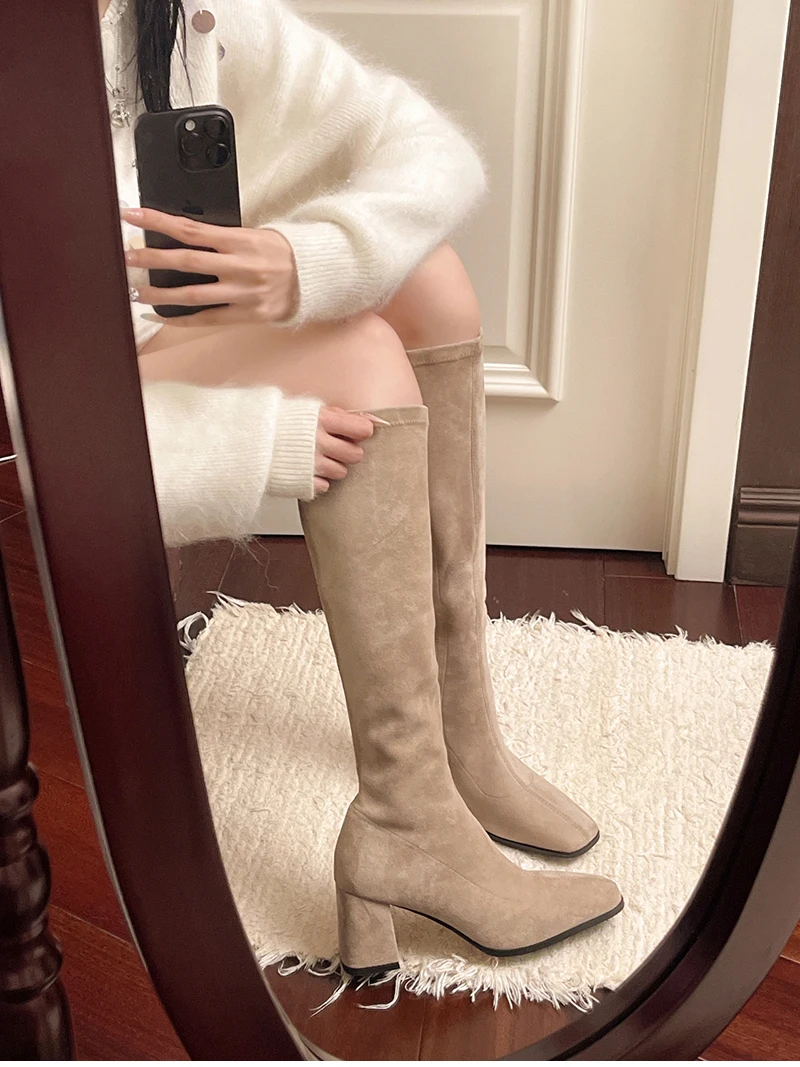 Autumn Winter Elastic Slimming Women Sock Loots Fashion Female Square Toe Thick Heel Knee High Booties