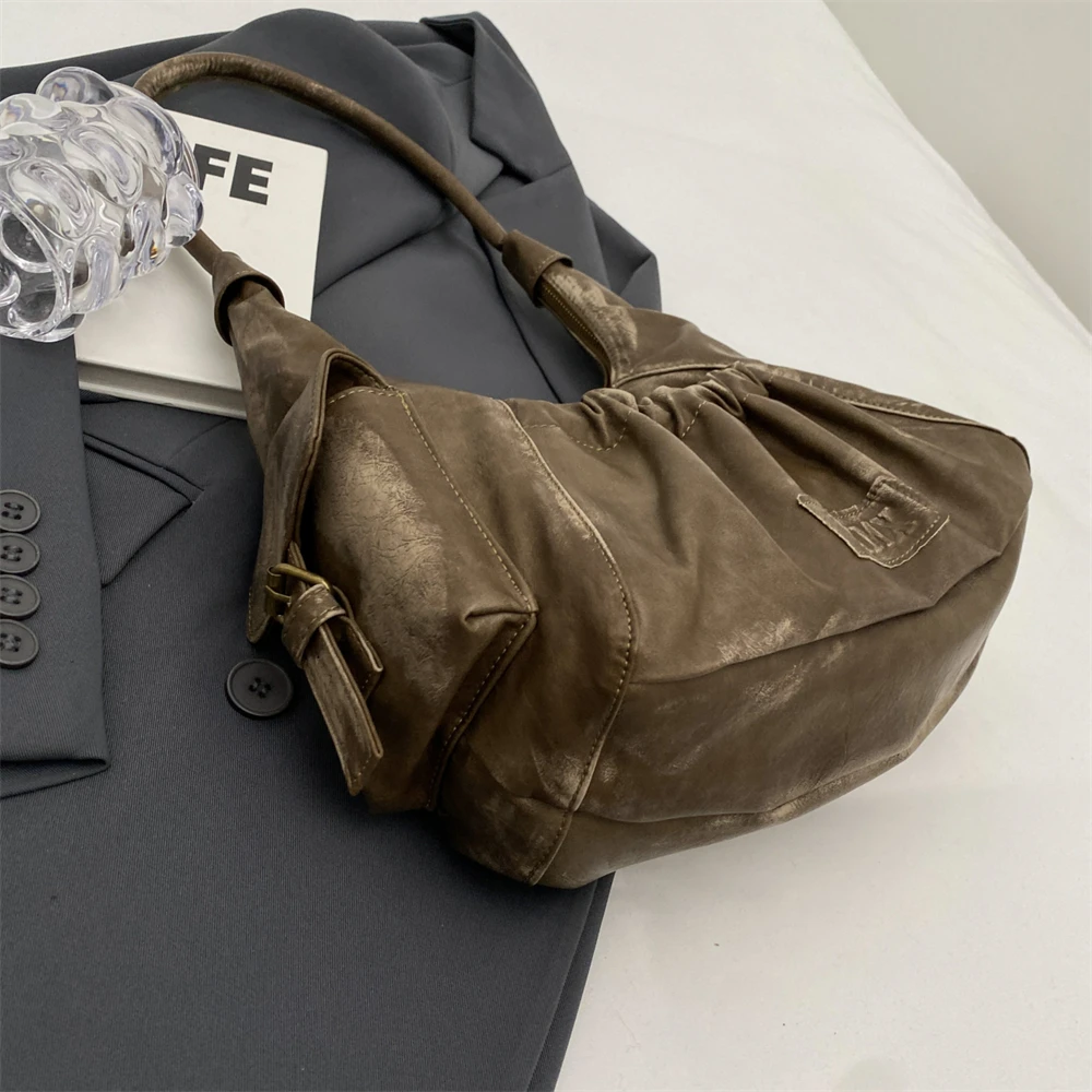 Distressed Vintage Shoulder Bags For Women Pleated Design Large Capacity Retro Hobo Bag 2024 Winter New Designer Handbags Luxury