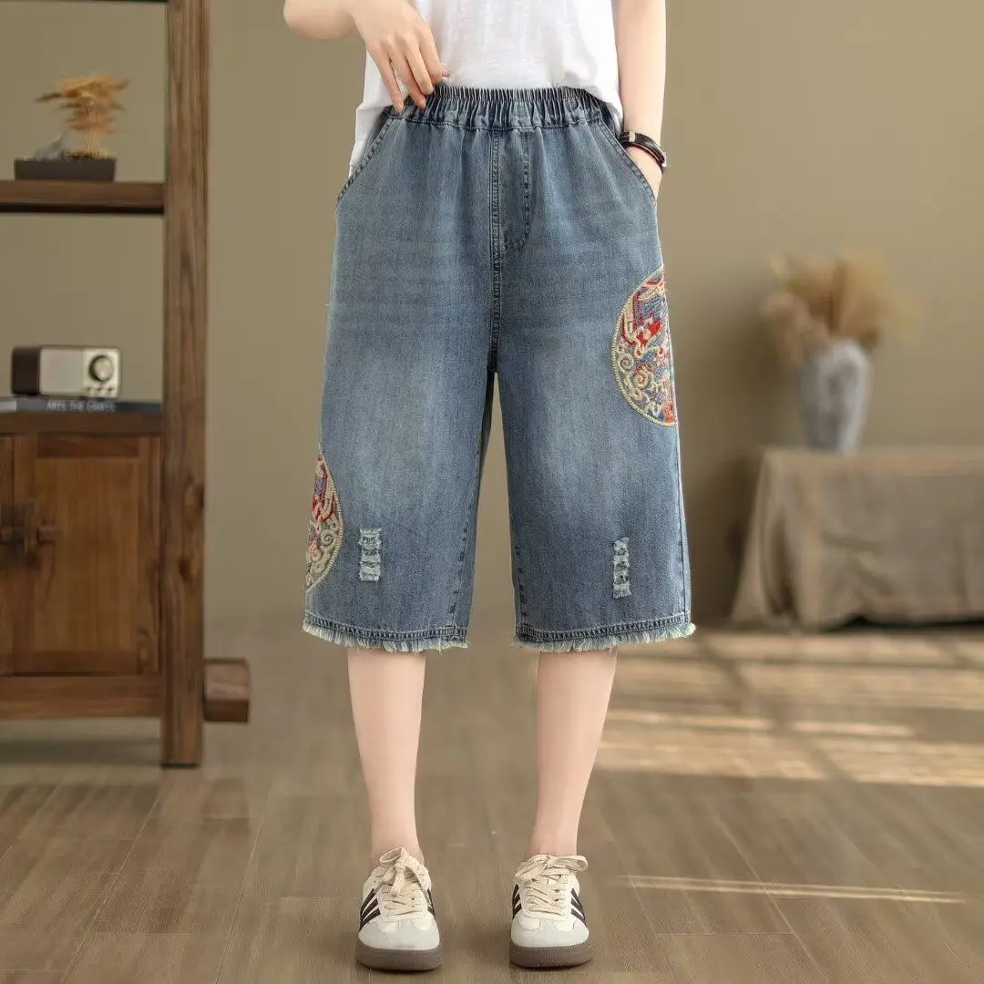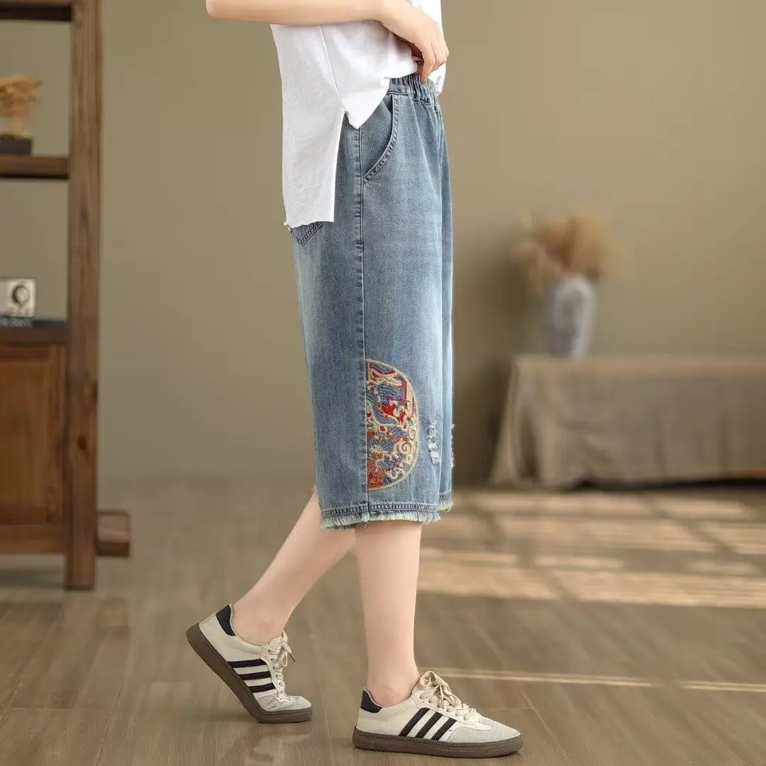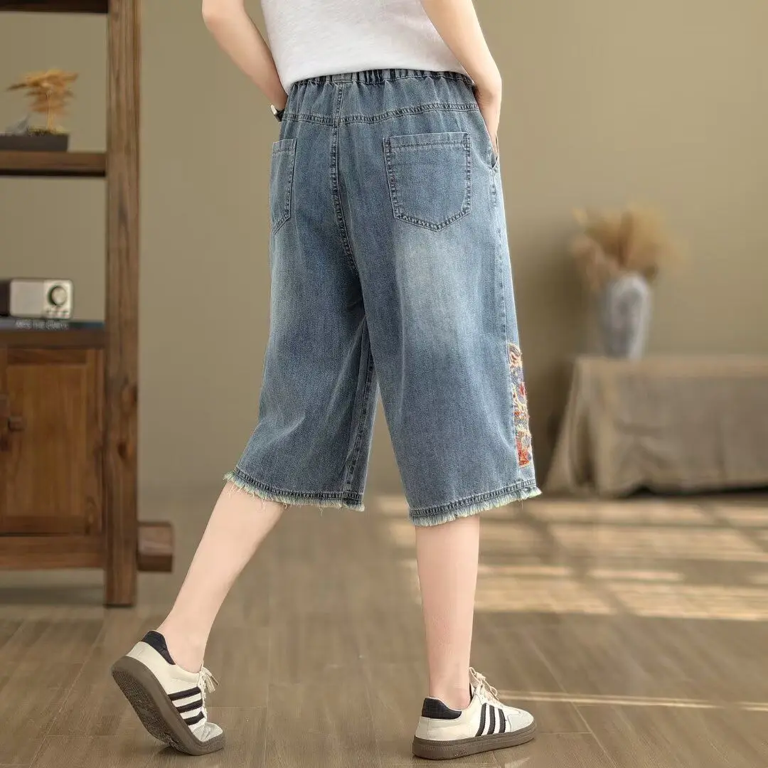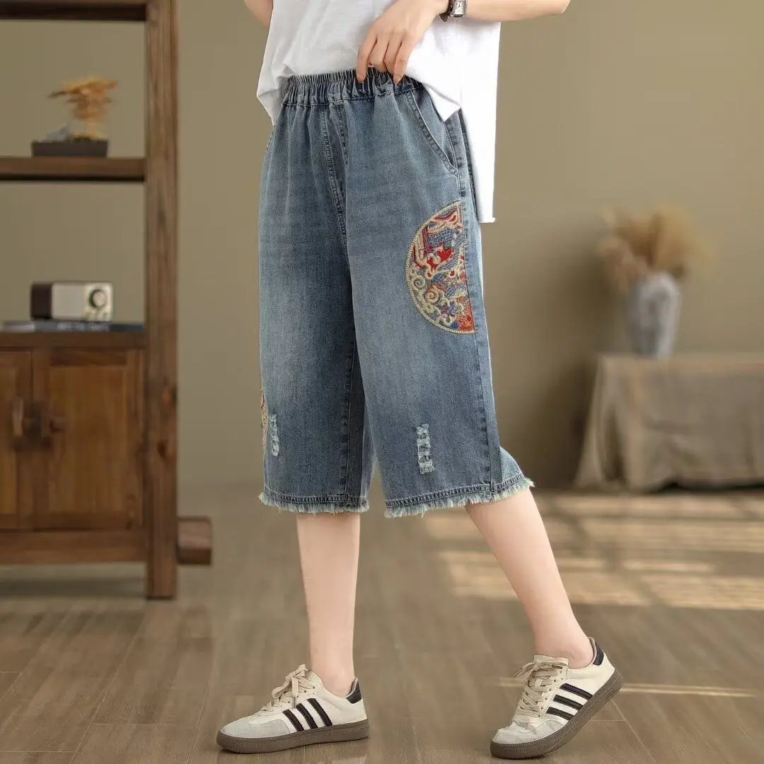 Embroidery New Chinese Style Denim Culottes for Women Summer Thin Style New High Waist Loose Casual Wide Leg Pants