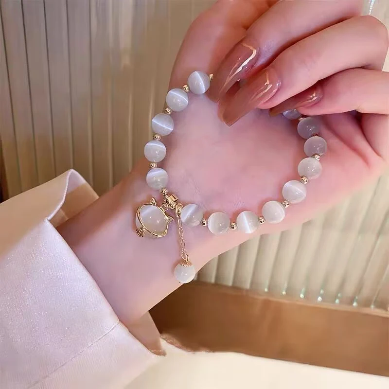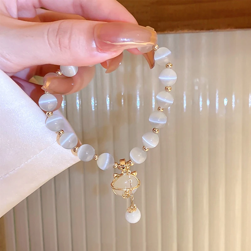 Exquisite Opal Beaded Bracelet For Women Elegant Lucky Cat Pendant Elastic Bracelets Fashion Light Luxury Jewelry Girls Gifts