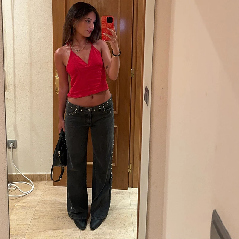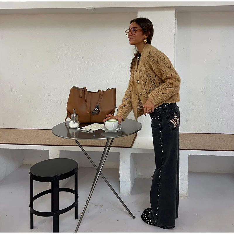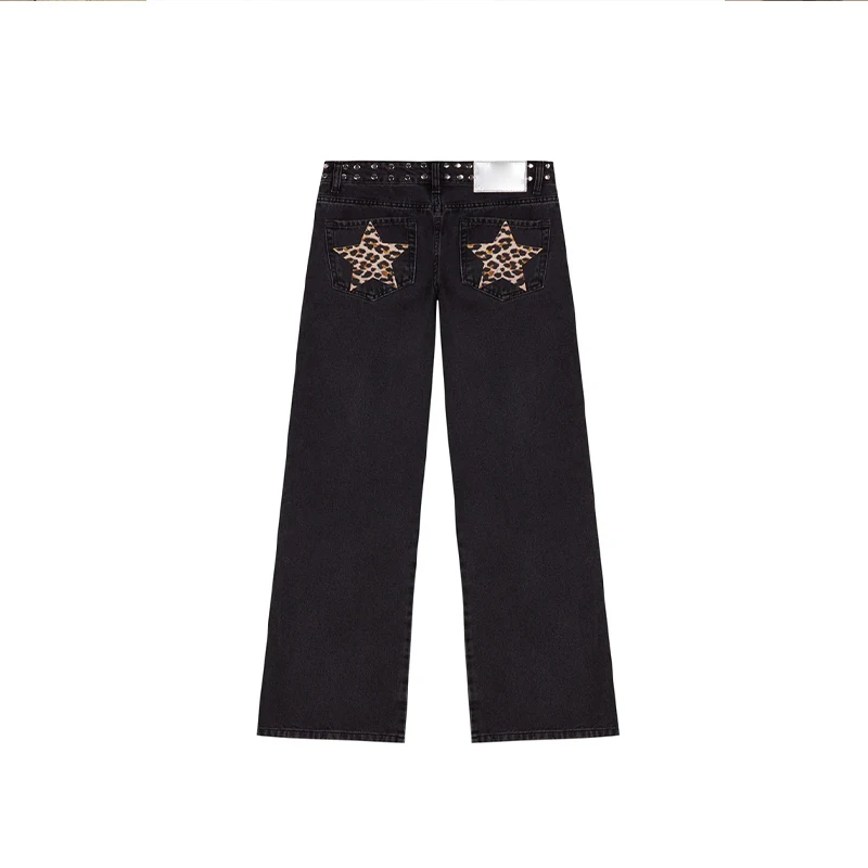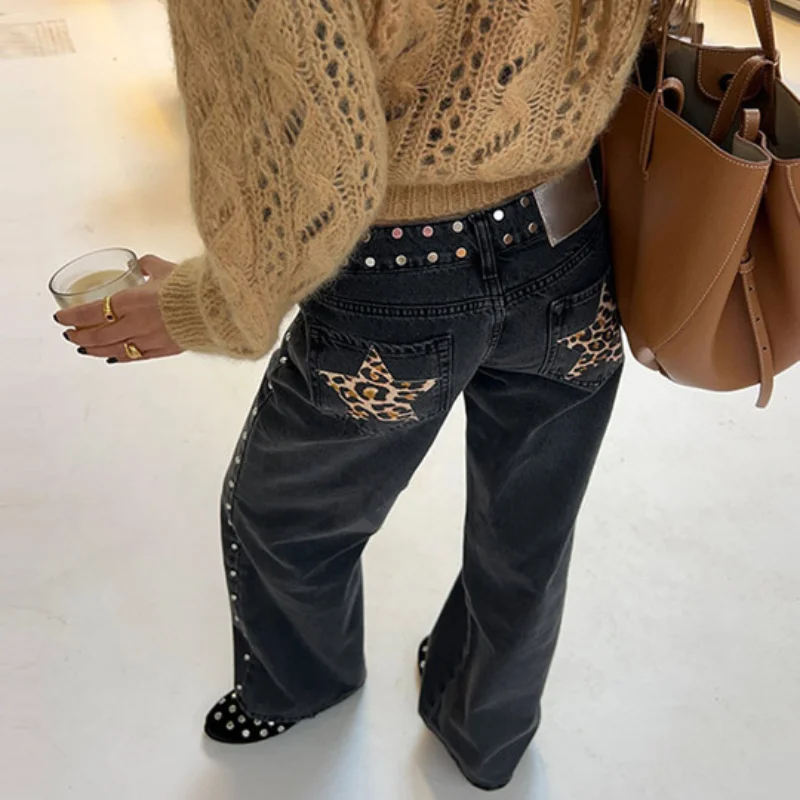 Fashion Beading Star Leopard Patchwork Jeans Women Pockets Low Waist Straight Denim Trousers 2025 Autumn Lady Streetwears New
