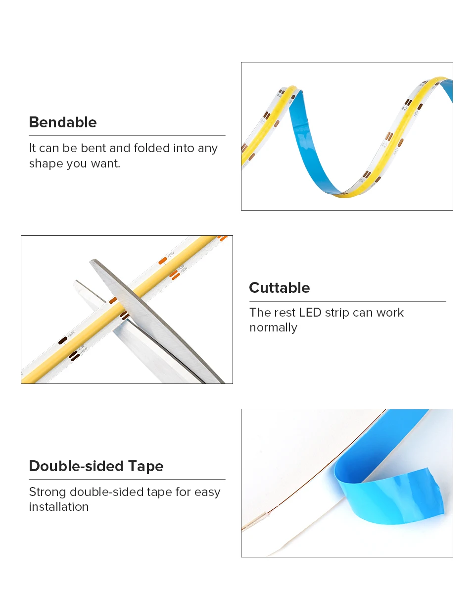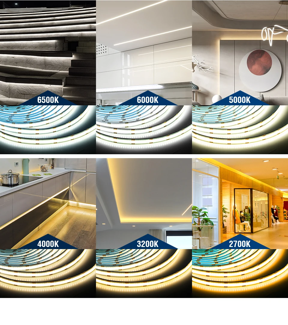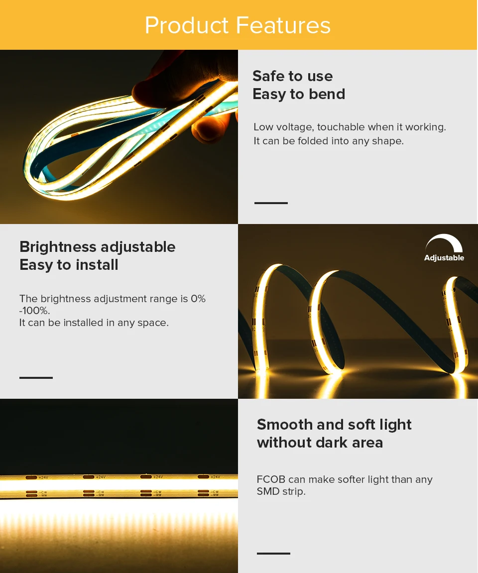 FCOB CCT LED Light Strip 640 LEDs High Density Flexible FOB COB 10mm Led Lights RA90 2700K to 6000K Linear Dimmable DC12V DC24V
