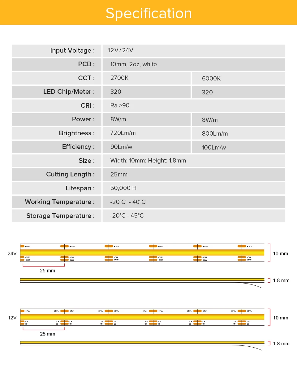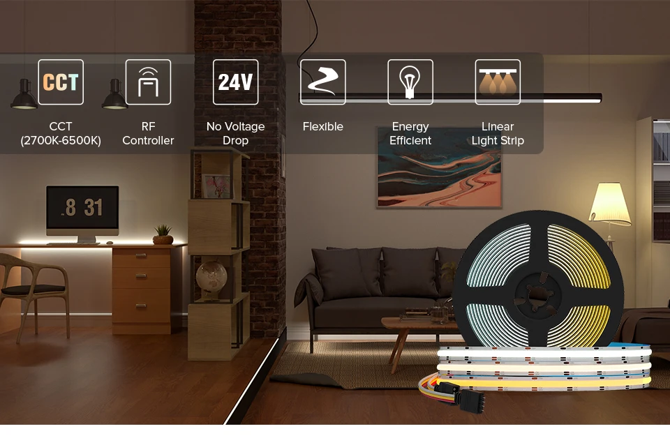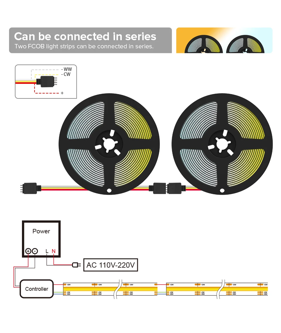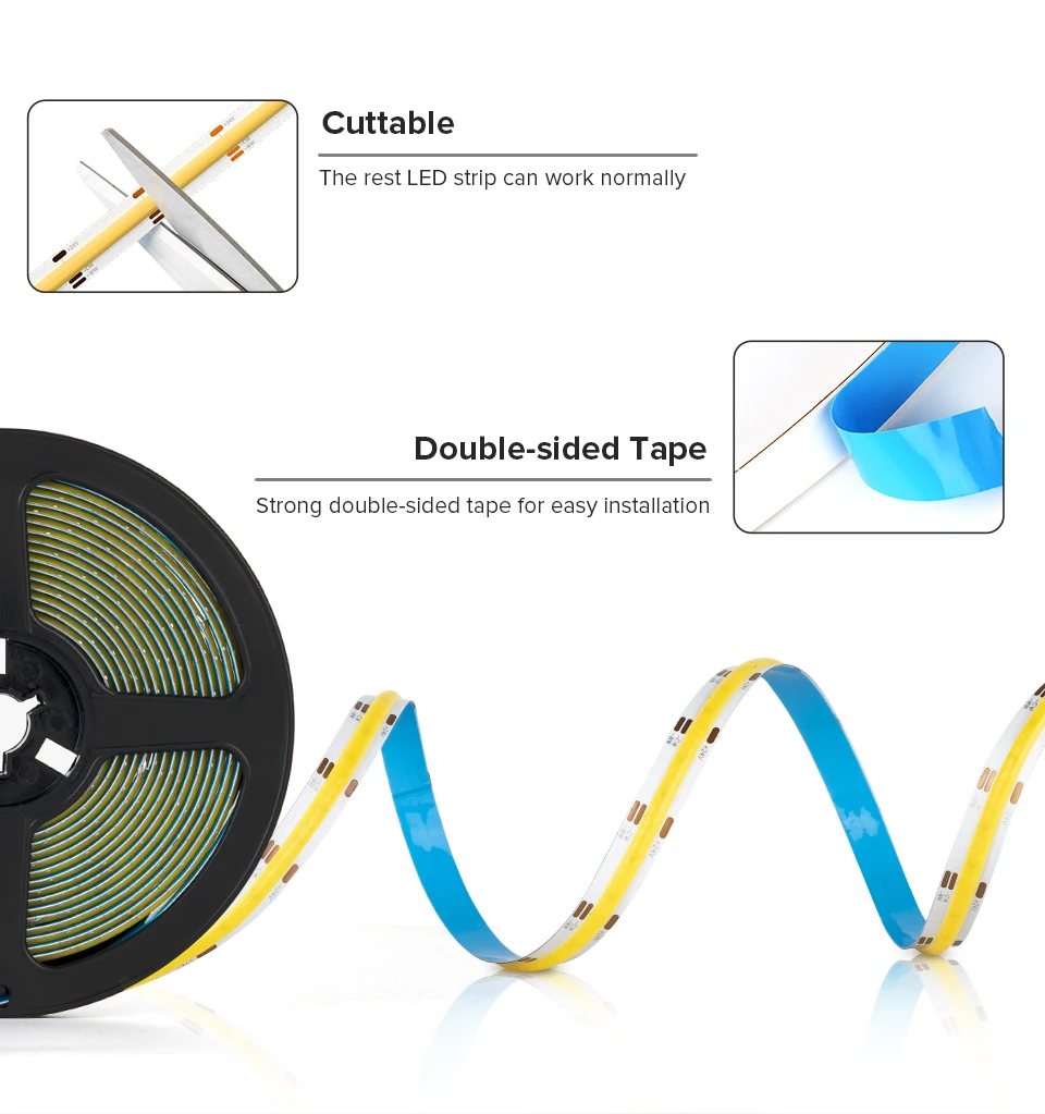 FCOB CCT LED Light Strip 640 LEDs High Density Flexible FOB COB 10mm Led Lights RA90 2700K to 6000K Linear Dimmable DC12V DC24V