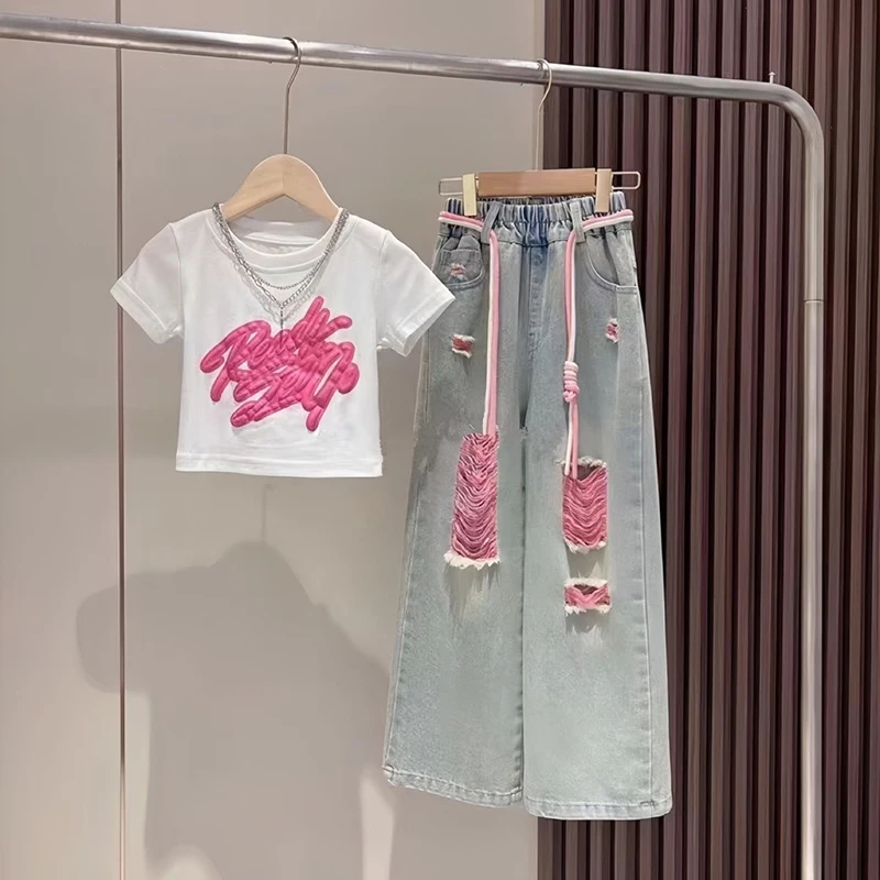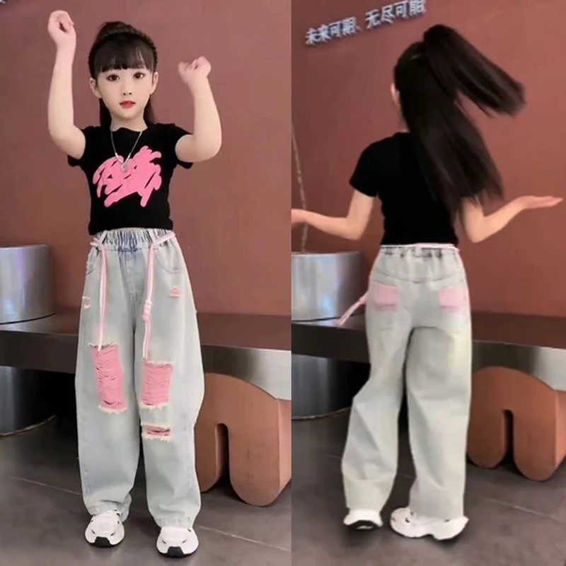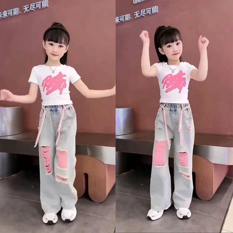 Kids Child New Jeans T-shirt 2 Pieces Clothing Set for Teen Girl High Fashion Streetwear Outfits Drawstring Pants & Tees Suit