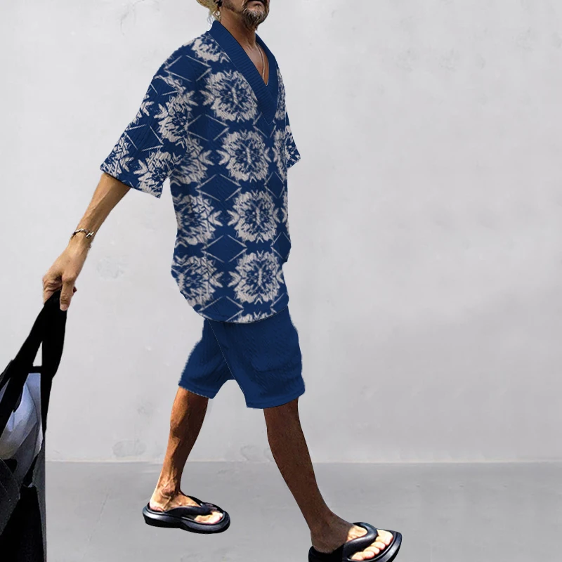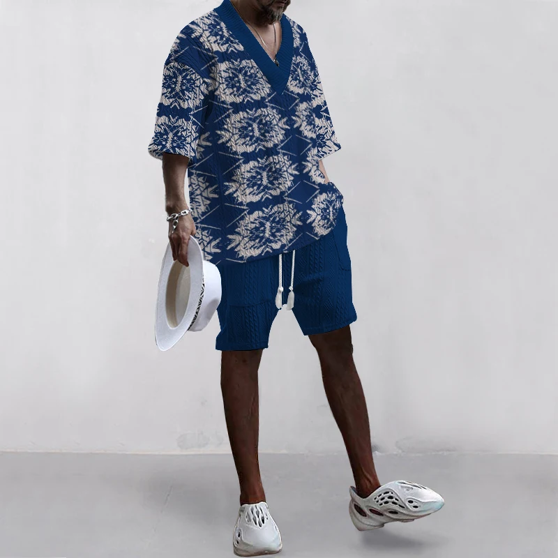 Men's Printed Casual Loose V Neck Luxury Textured Jacquard Fabric Half-Sleeved T-Shirt and Shorts Two-Piece Set, Fashionable Summer Men's Suit, Loose Fit, Breathable and Comfortable