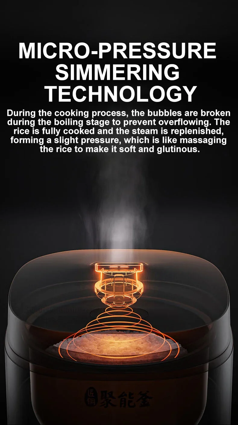 ●Micro-pressure simmering technology, during the cooking process, the bubbles are broken during the boiling stage to prevent overflow, and the rice is fully cooked and the steam is replenished, forming a micro-pressure;