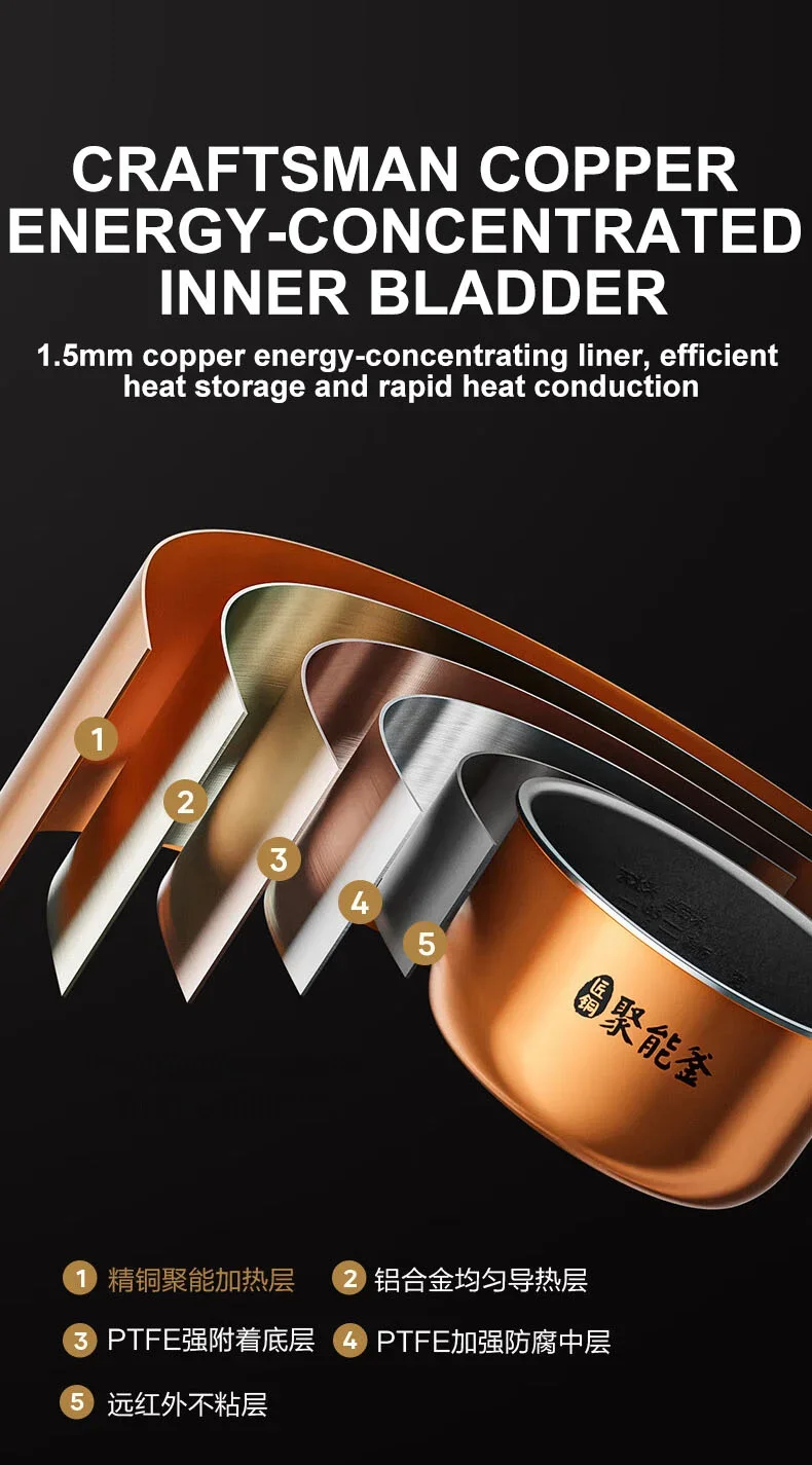 ●Non-stick energy-concentrating liner, 1.5mm craftsman copper energy-concentrating liner, efficient heat storage, rapid heat conduction, far-infrared non-stick coating is healthy and durable;