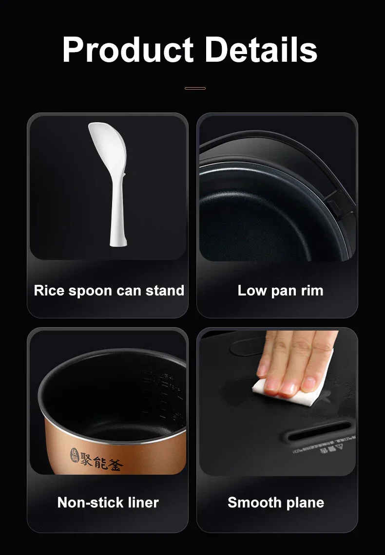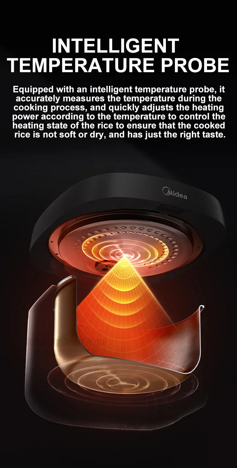 ●Equipped with an intelligent temperature probe, it accurately measures the temperature during the cooking process, and quickly adjusts the heating power according to the temperature to control the heating state of the rice to make it taste better.