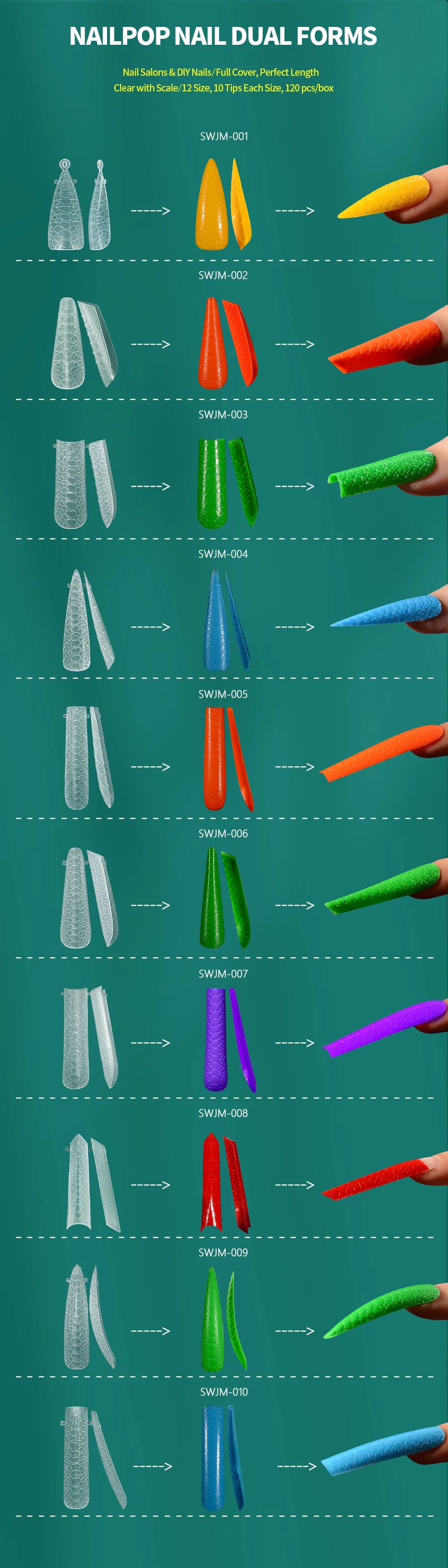 2.VARIED SIZE: The 120pcs artificial nails plastic forms offer 12 different sizes. 10pcs of each size. Fit most fingers and easily choose the suitable size that fits your every finger.