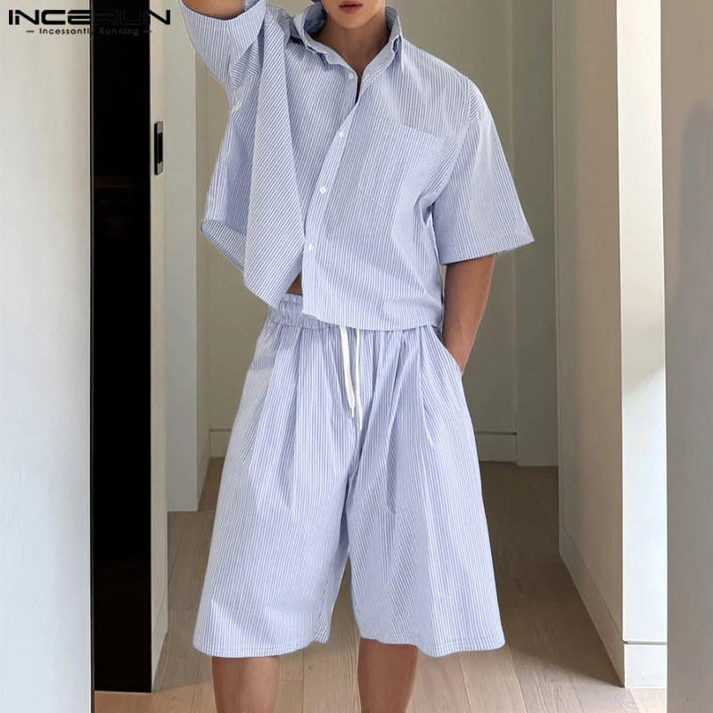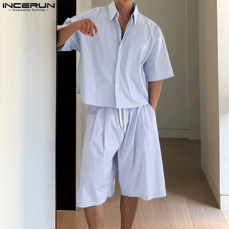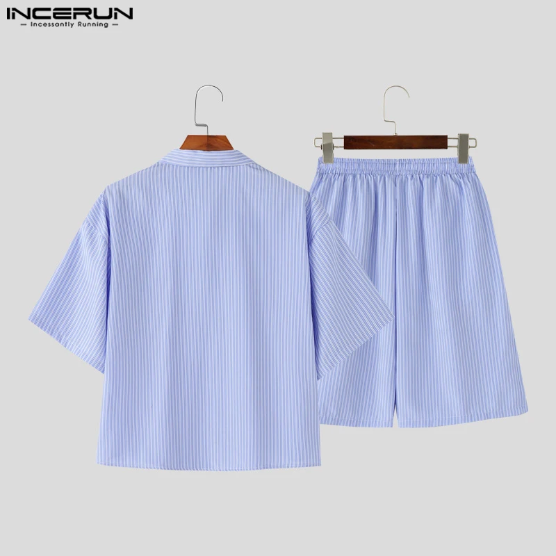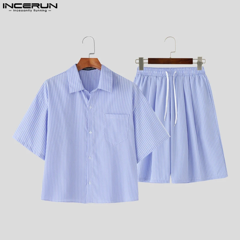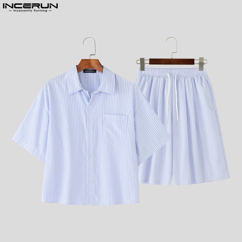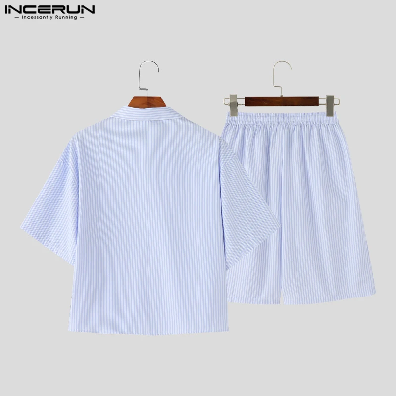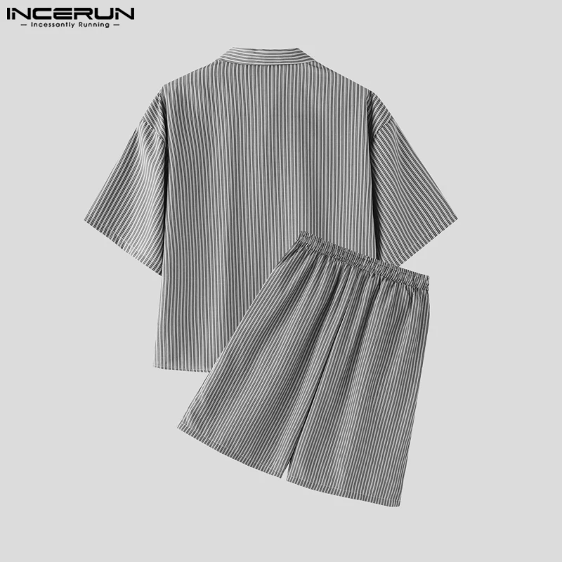 Summer Men's Sets Short Sleeve Tops Stripe Shirt Lapel Tee Loose Casual Shorts INCERUN Fashion 2PCS Suit Short Trousers Oversize