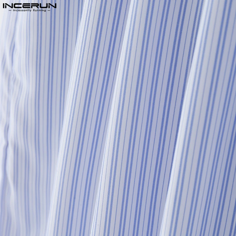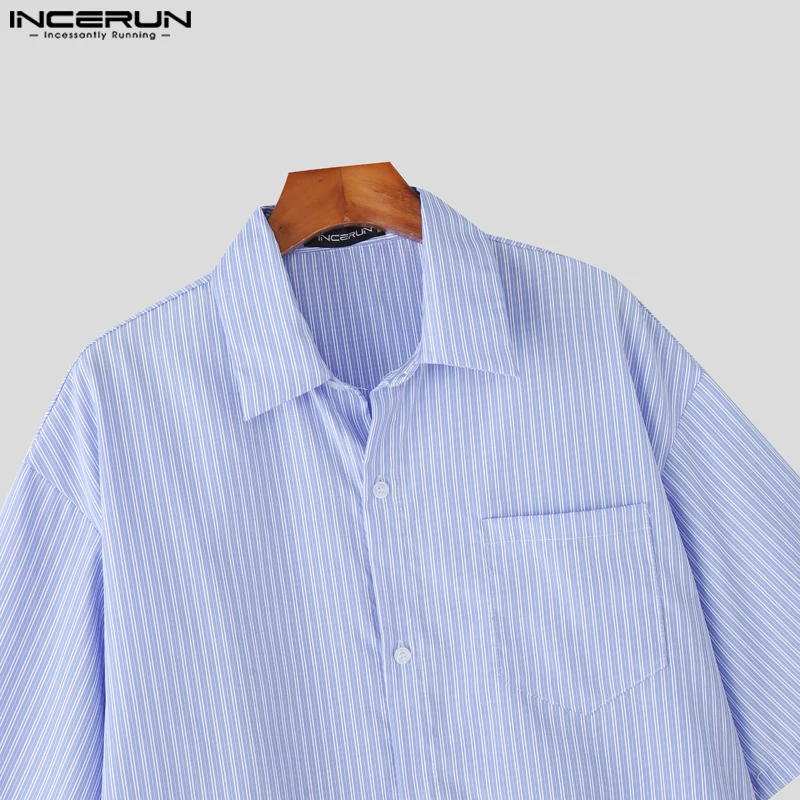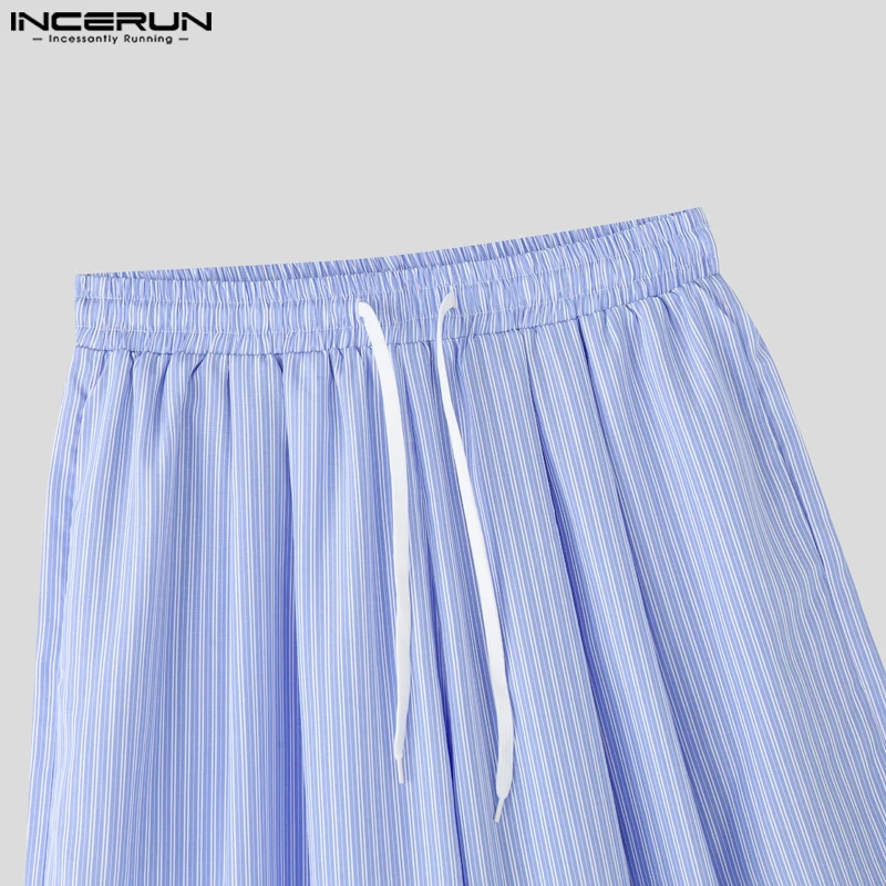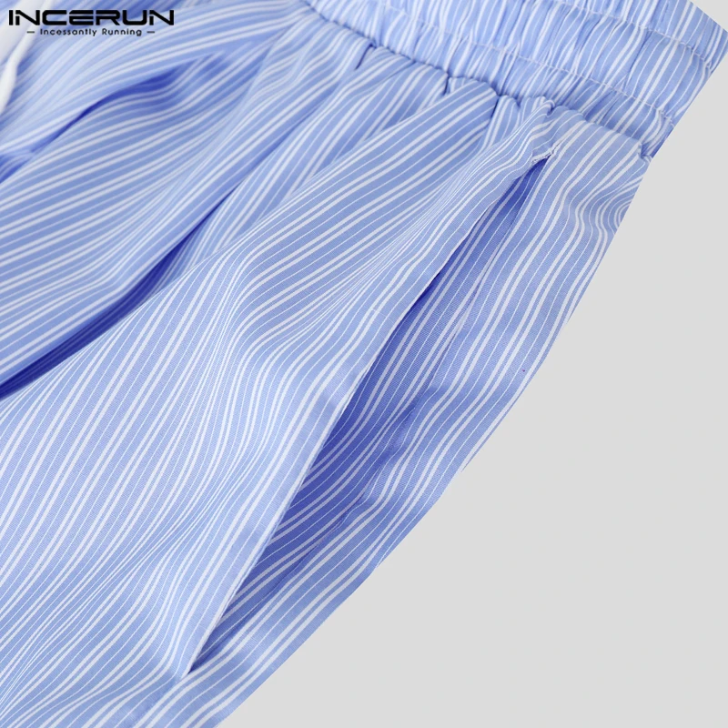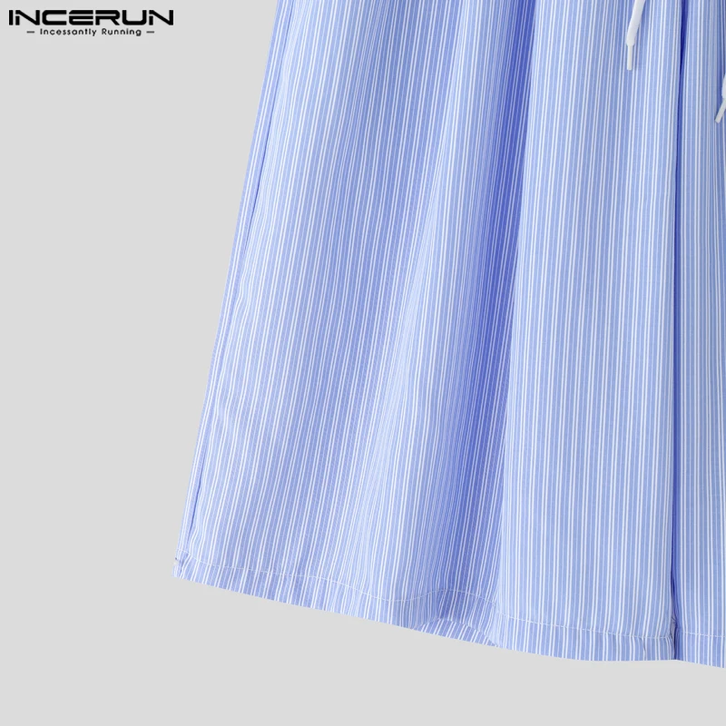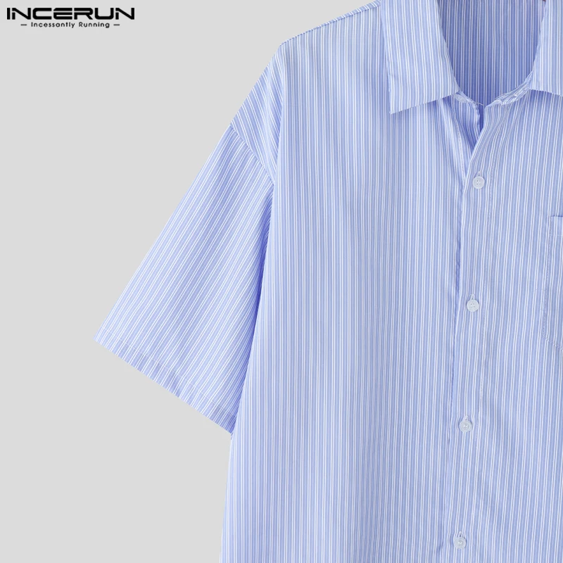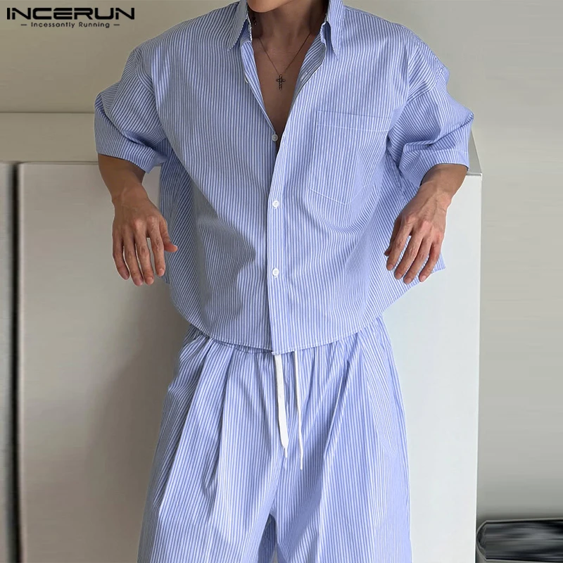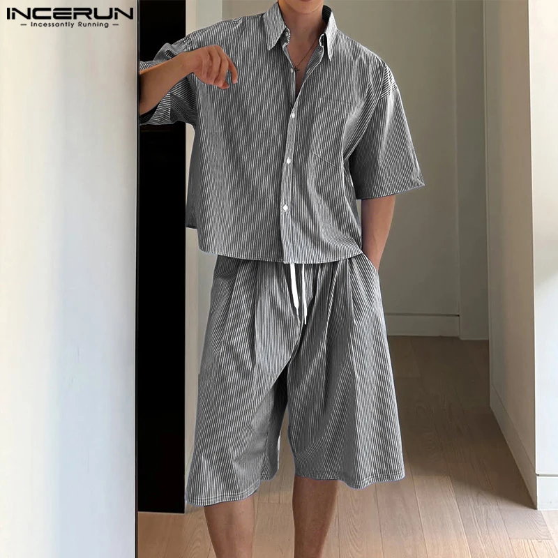 Summer Men's Sets Short Sleeve Tops Stripe Shirt Lapel Tee Loose Casual Shorts INCERUN Fashion 2PCS Suit Short Trousers Oversize