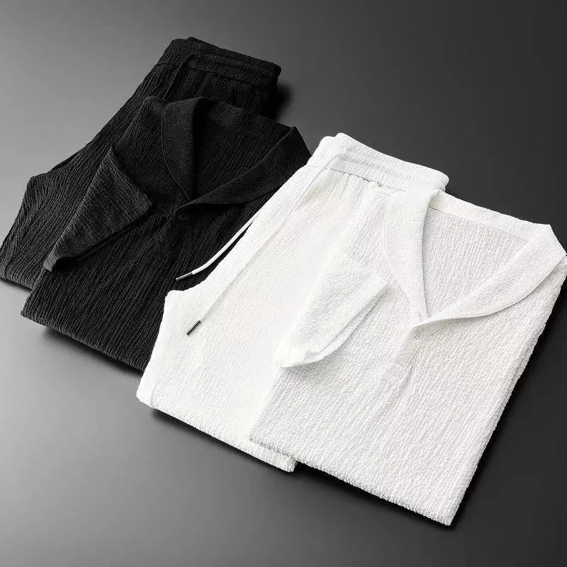 Summer Ultra-thin Two-piece Ice Silk Linen Suit Men's Cotton Linen 2-piece Set Loose-fit Mid-sleeve T-shirt Sports Wear