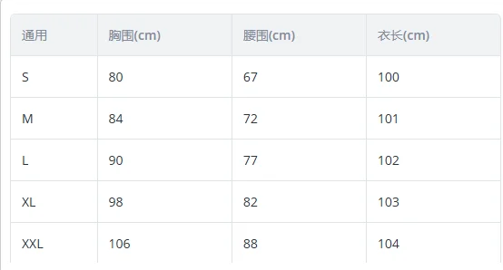 size_info: {"sizeInfoList":[{"length":{"cm":"80","inch":"31.50"},"size":"S","vid":-1},{"length":{"cm":"84","inch":"33.07"},"size":"M","vid":-2},{"length":{"cm":"90","inch":"35.43"},"size":"L","vid":-3},{"length":{"cm":"98","inch":"38.58"},"size":"XL","vid":-4},{"length":{"cm":"106","inch":"41.73"},"size":"XXL","vid":-5}]}