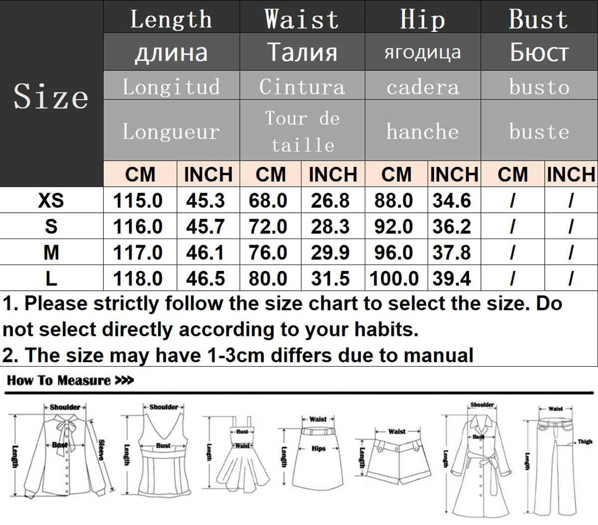 size_info: {"sizeInfoList":[{"length":{"cm":"115","inch":"45.28"},"size":"XS","vid":-1},{"length":{"cm":"116","inch":"45.67"},"size":"S","vid":-2},{"length":{"cm":"117","inch":"46.06"},"size":"M","vid":-3},{"length":{"cm":"118","inch":"46.46"},"size":"L","vid":-4}]}