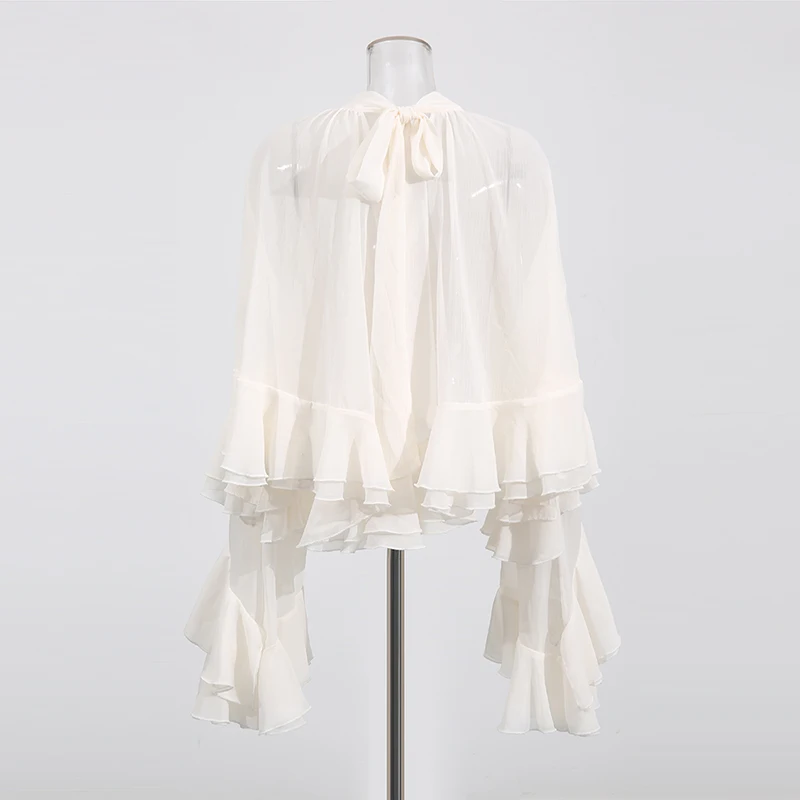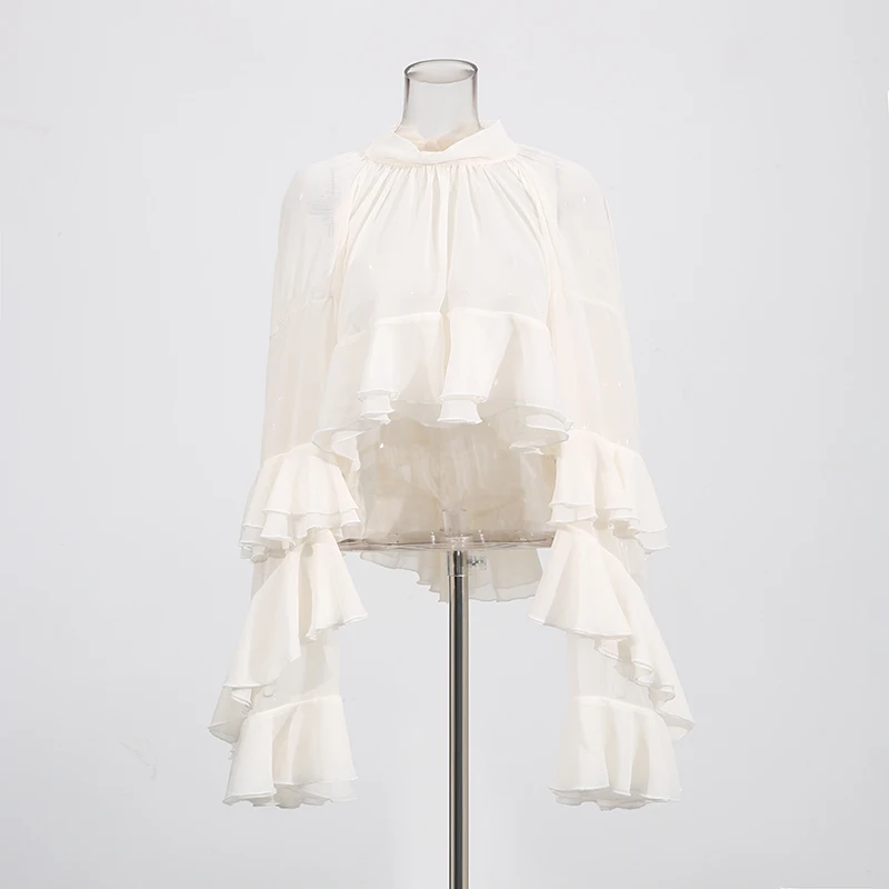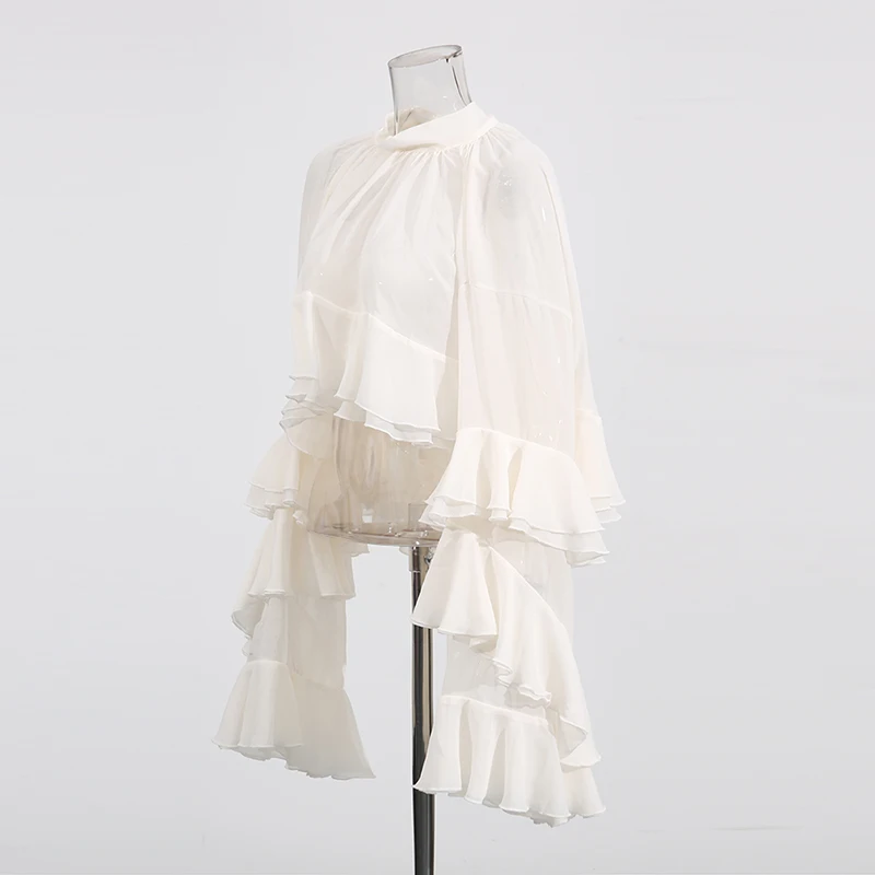 TWOTWINSTYLE Solid Loose Sheer Blouses for Women High Neck Long Sleeves Patchwork Ruffles Folds Elegant Blouse Female Clothing