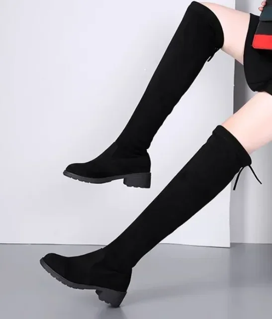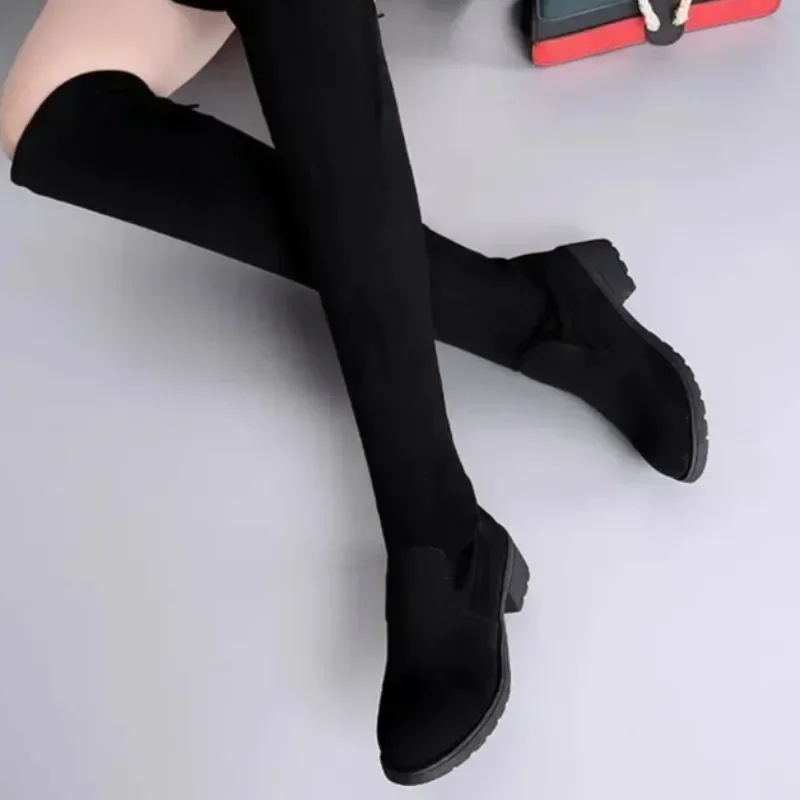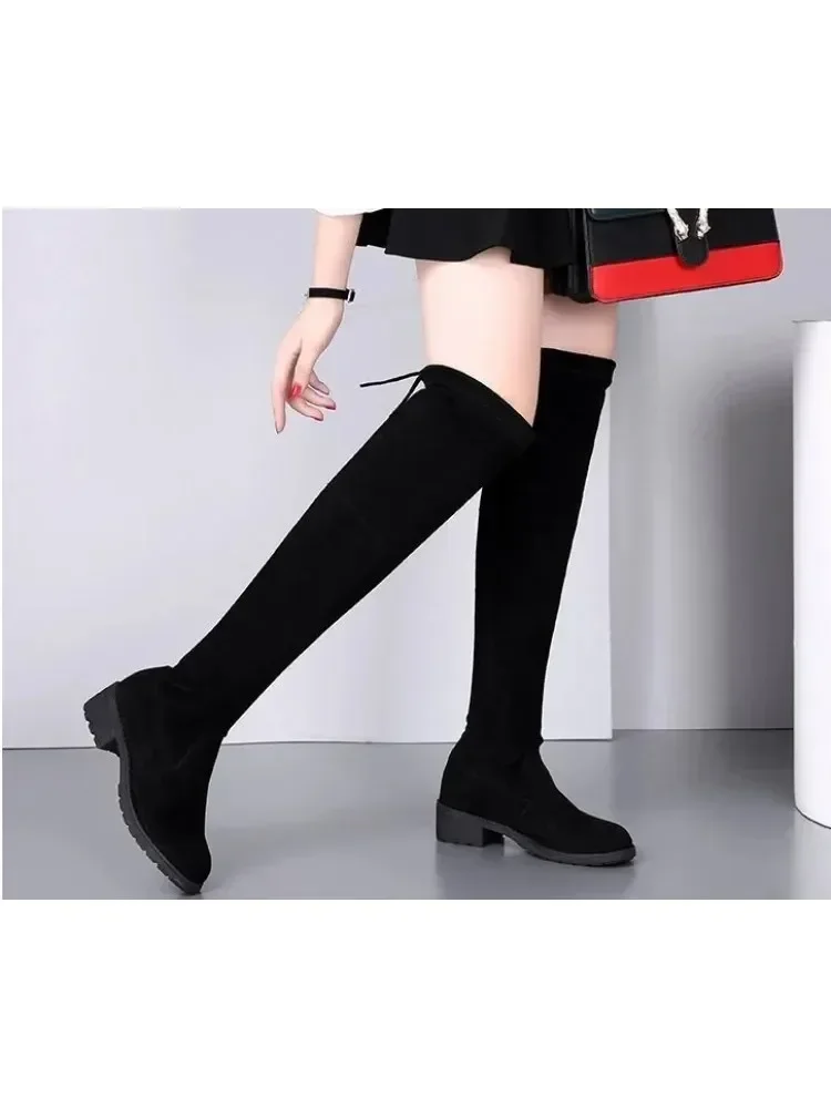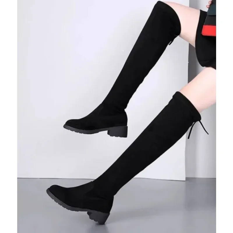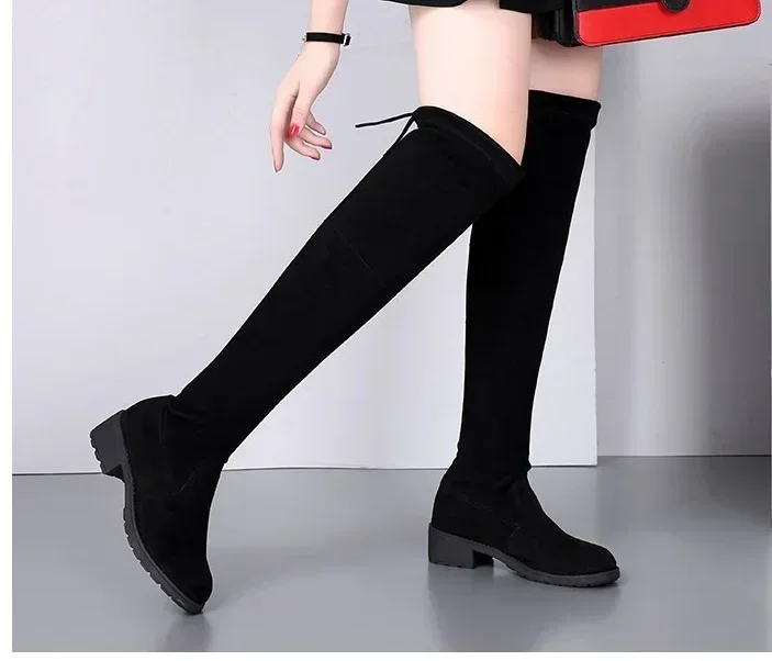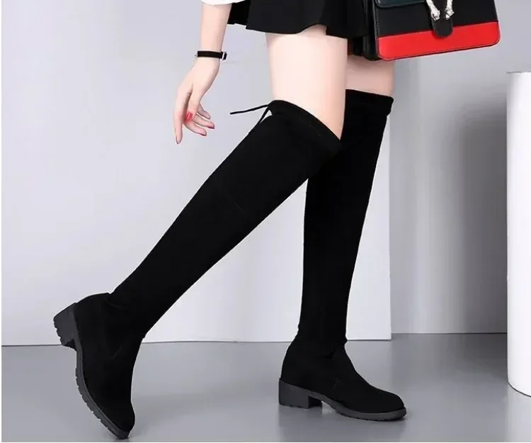 Women Boots Winter Black Over The Knee Boots 2024 New Comfort Lace Up Chunky High Heels Shoes Fashion Warm Suede Round Toe Boots