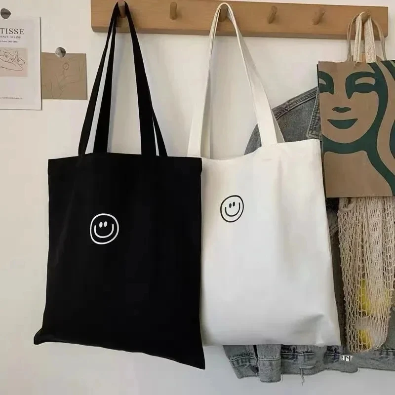 Women Canvas Shoulder Bag Smiling Face Print Ladies Casual Handbag Tote Bag Large Capacity Reusable Shopping Beach Travel Bag