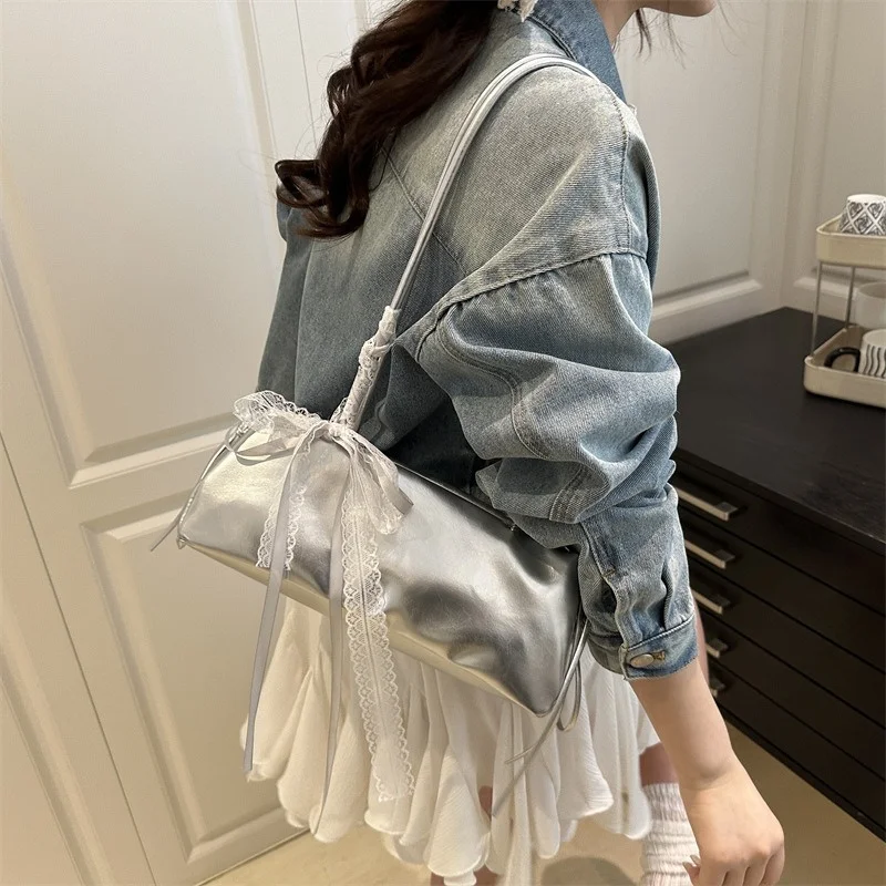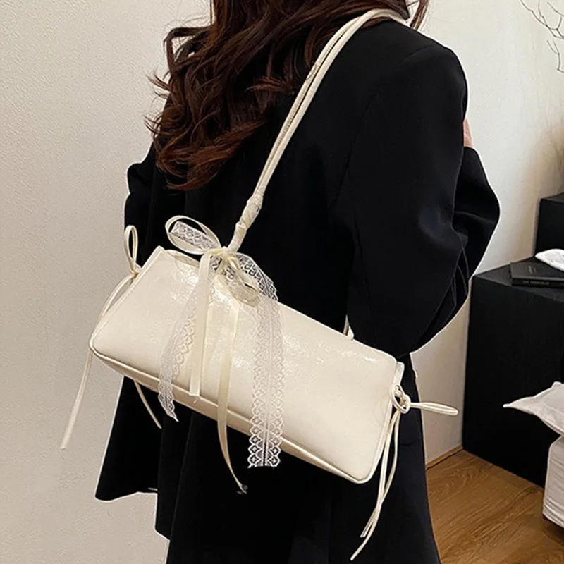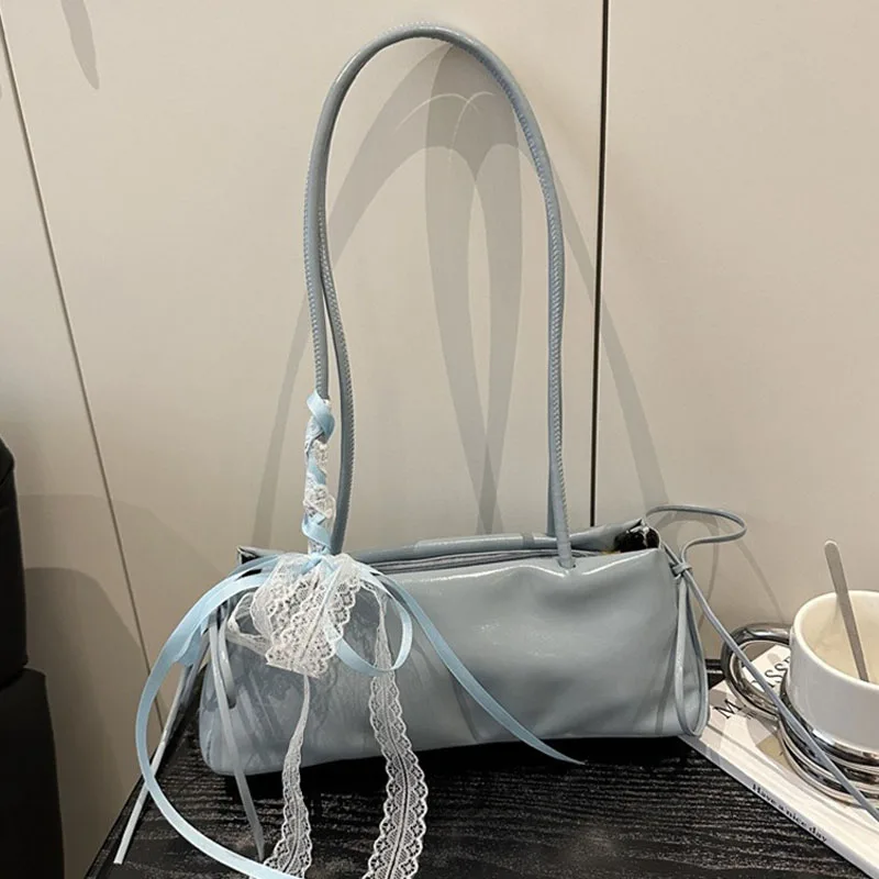 This underarm bag perfectly captures the essence of current popular ballet aesthetics, like a delicate accessory that enters daily life from an elegant ballet stage. The main body of the bag is made of soft and delicate materials, with exquisite lace bows, creating a romantic texture. The most eye-catching design is undoubtedly the lace bow embellished with shoulder straps, carefully tied with white lace satin, which is the soul of the entire bag, instantly injecting a full girlish heart and the lively atmosphere of ballet dancers. The shoulder strap length is just right, easily worn under the armpit, outlining a sleek retro silhouette while shining with a light luxury luster. The bag is small and exquisite, with smooth and rounded lines, exuding a sweet, gentle, and exquisite French romantic atmosphere as a whole.