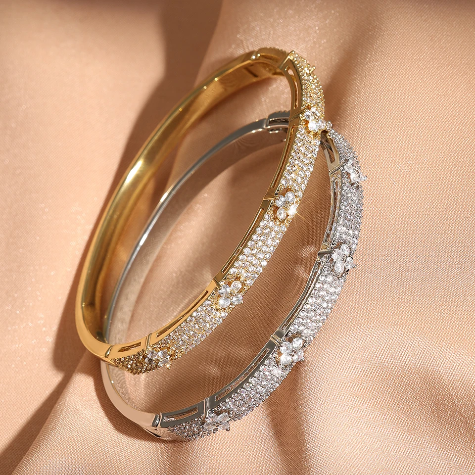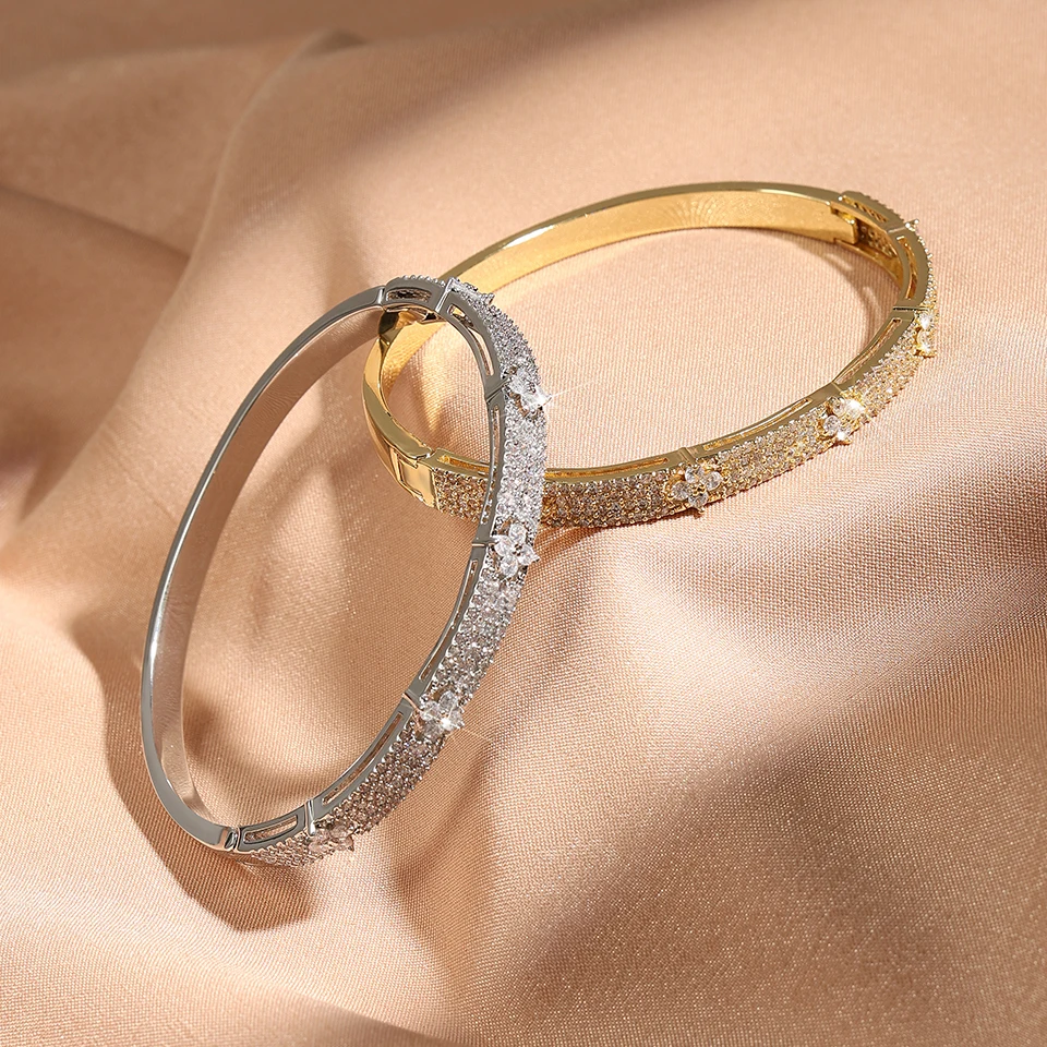 Yupsk Luxury Shiny Full Zircon Open Bangle Bracelet for Women Exquisite Brass Flowers Design Wedding Party Jewelry Gift