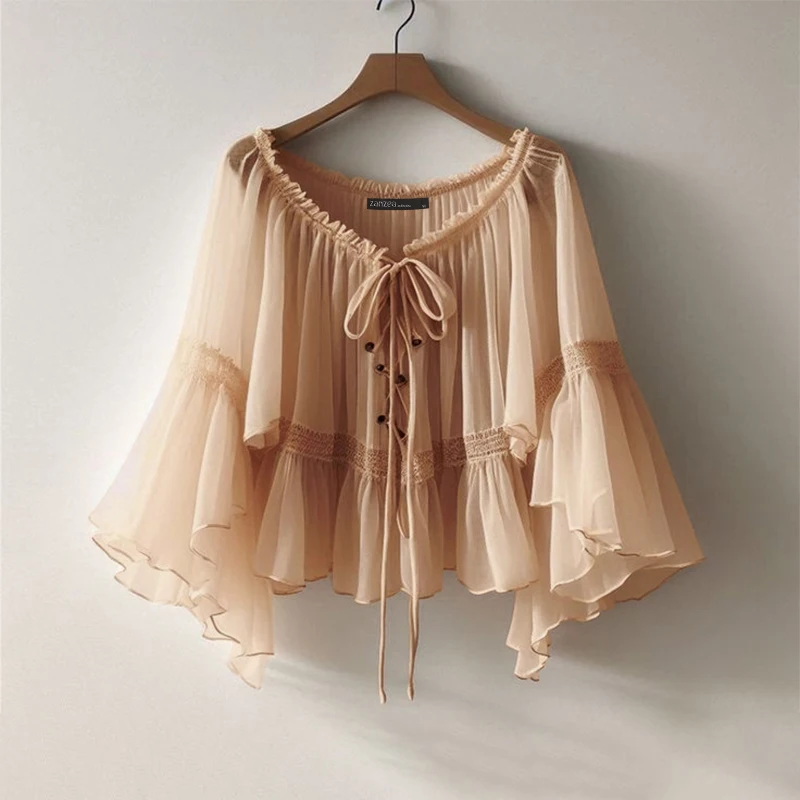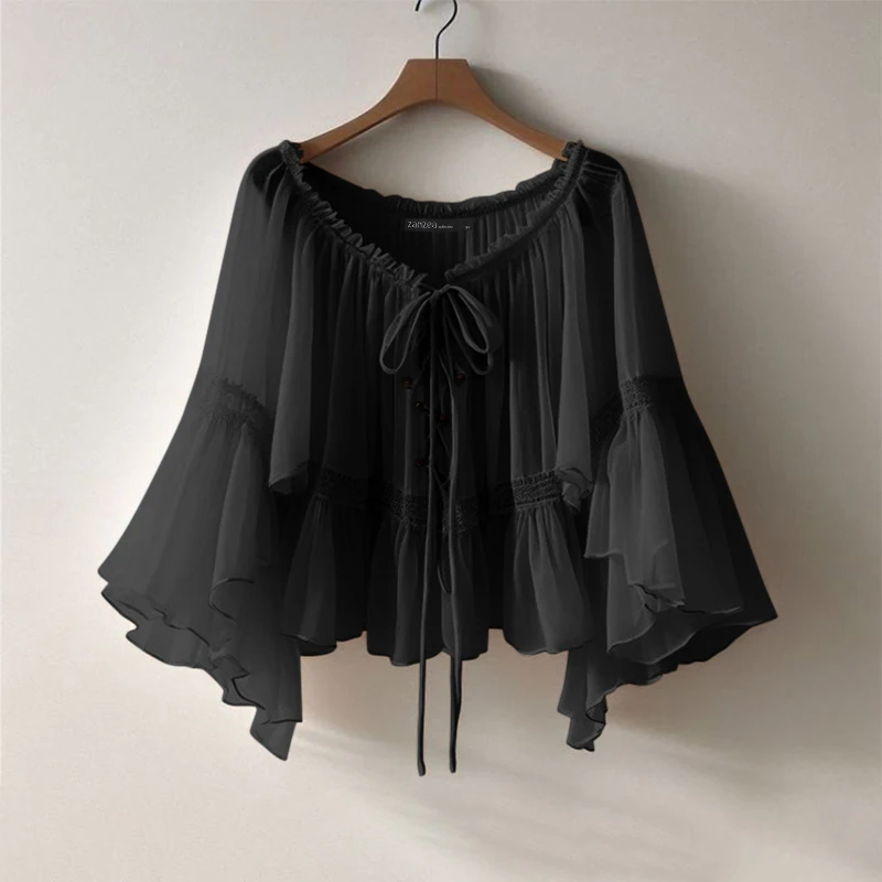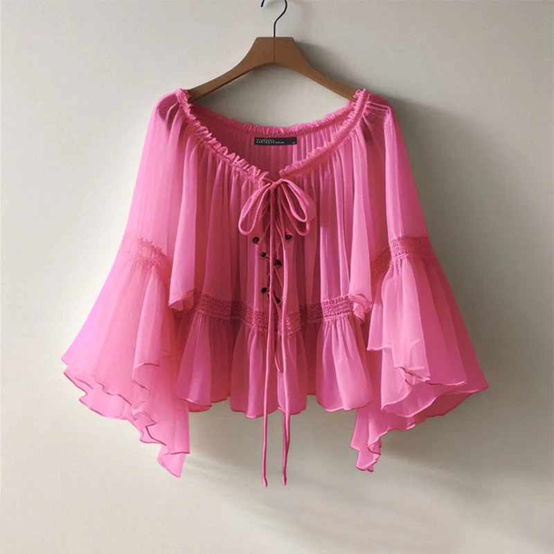 ZANZEA Women Vintage Chiffon Blouse Casual Loose 3/4 Flare Sleeve Short Tops 2025 Summer Seethrough V-neck Pleating Blusas Femme